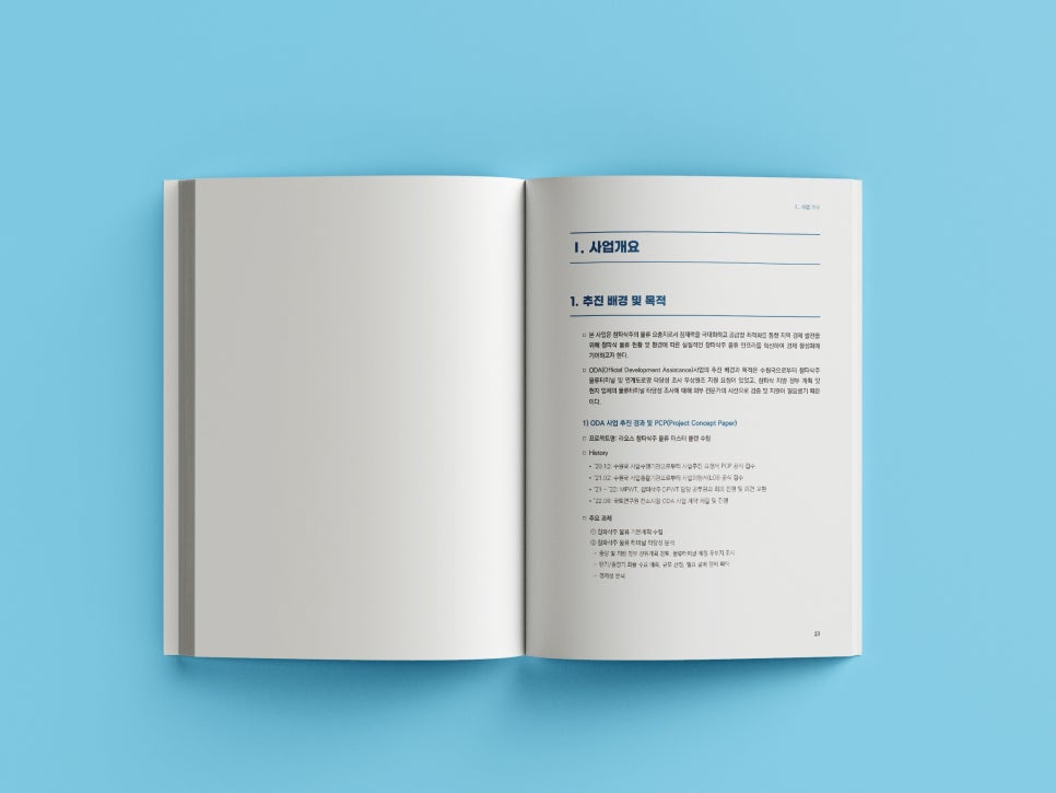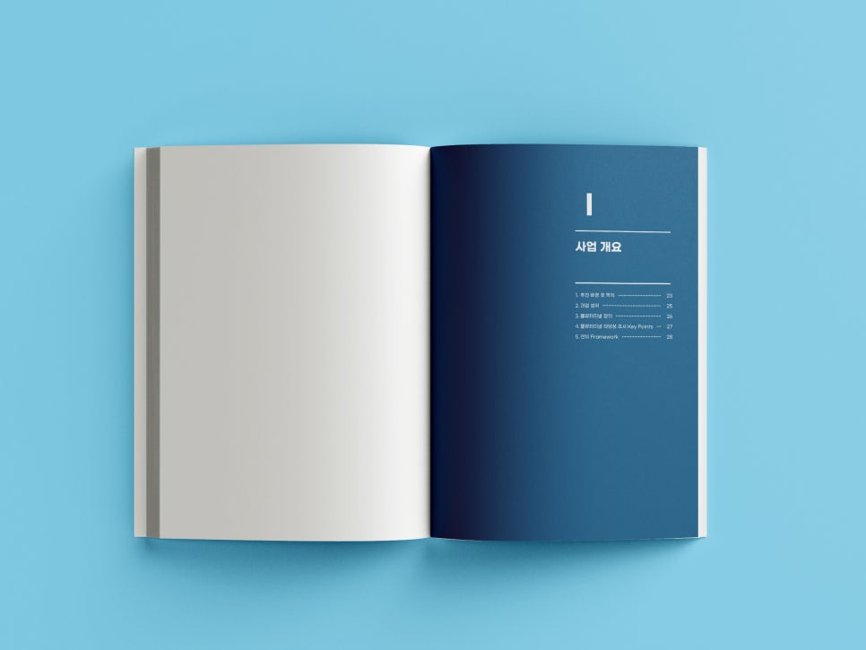 공공기관에 납품하는 보고서 목적에 적합하게 불필요한 그래픽 요소는 최대한 배제하고 신뢰성을 상징하는 블루컬러를 활용하여 깔끔한 보고서 디자인을 하였습니다.
