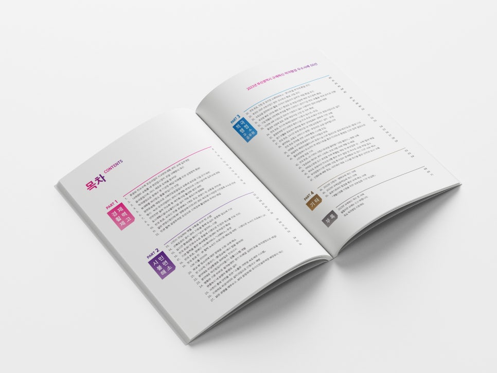 부산광역시 심벌마크의 그래픽 모티브와 보더라인을 활용하여 우수사례 50선의 인덱스 디자인하였으며, 전용 패턴을 사용하여 각 장의 간지에 사용하였습니다.